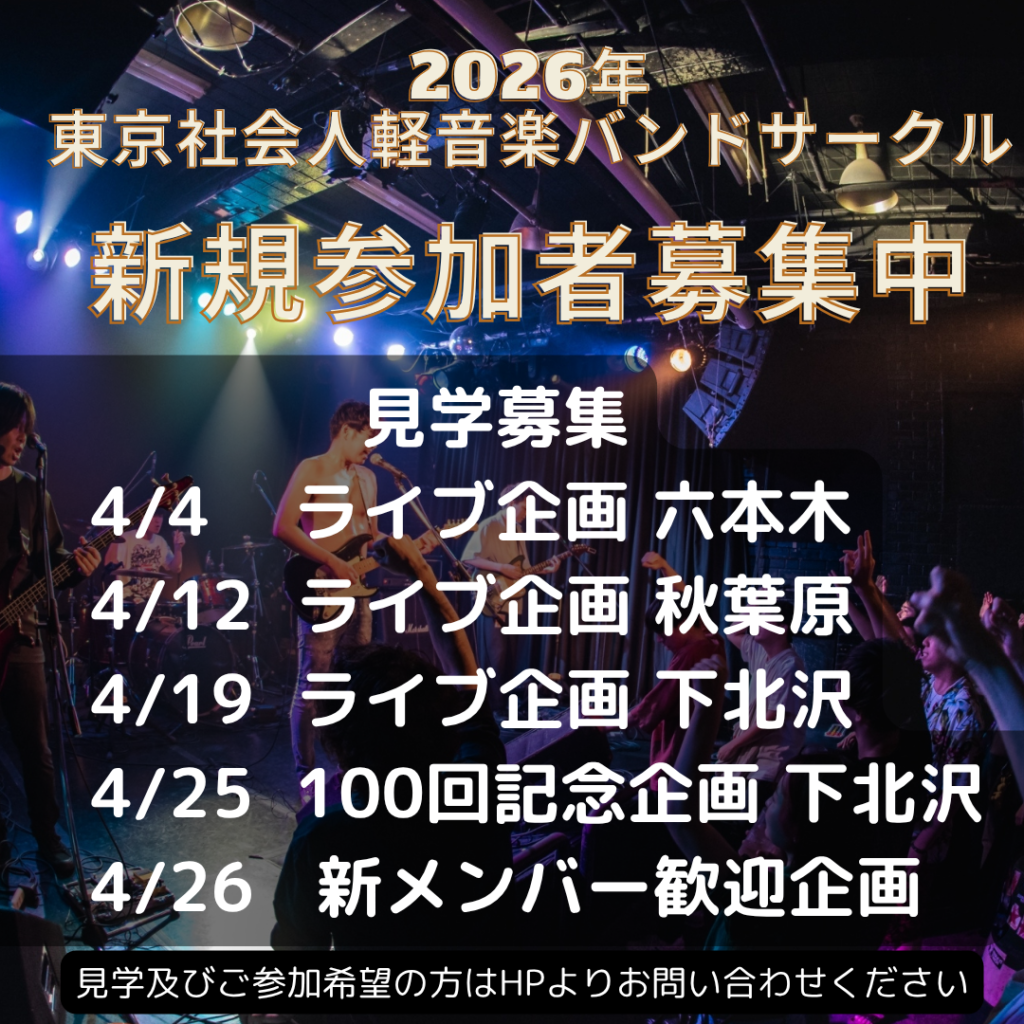 【2026年3月】社会人バンドライブ|東京社会人軽音サークル(初心者OK新メンバー募集) Uncategorized 2026.03.26 👇現在のライブ見学日程はこちら ライブ見学を予約する見学&問い合わせはこちらをクリック! オリジナルバンドやコピーバンドの出演希望ははこちらをクリック! よくある質問をこちらでまとめておりますので、ご覧ください!